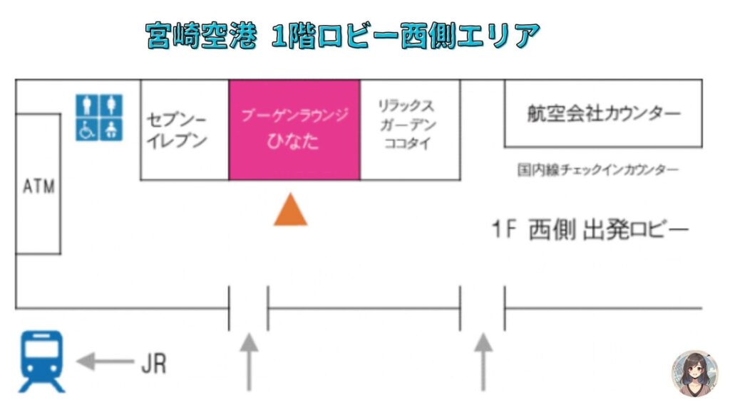 ひなたは、1階の出発ロビーにあります。JRの乗り場と近いため、空港に到着して出発までの時間を過ごすのにぴったりです。