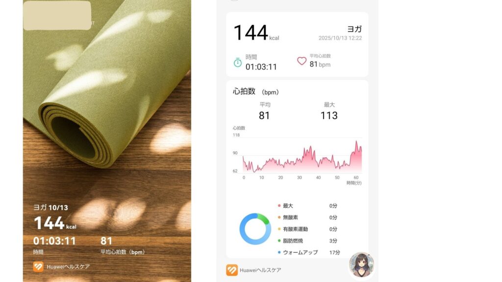 運動量が低いレッスンですが、滝のような汗をかけるため、1レッスンでこれだけのカロリー消費(144kcal)ができたのは嬉しい驚きです。
