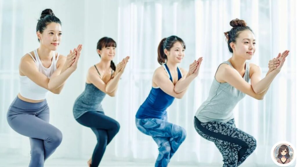 脚を前後に大きく開き、骨盤を立てて上半身をまっすぐ伸ばすポーズ。脚を開いて腰を深く落とし、膝とつま先を同じ方向に向けるスクワットのようなポーズ。両足を大きく開いて片手を上にあげる三角のポーズなど、様々なポーズをとります。