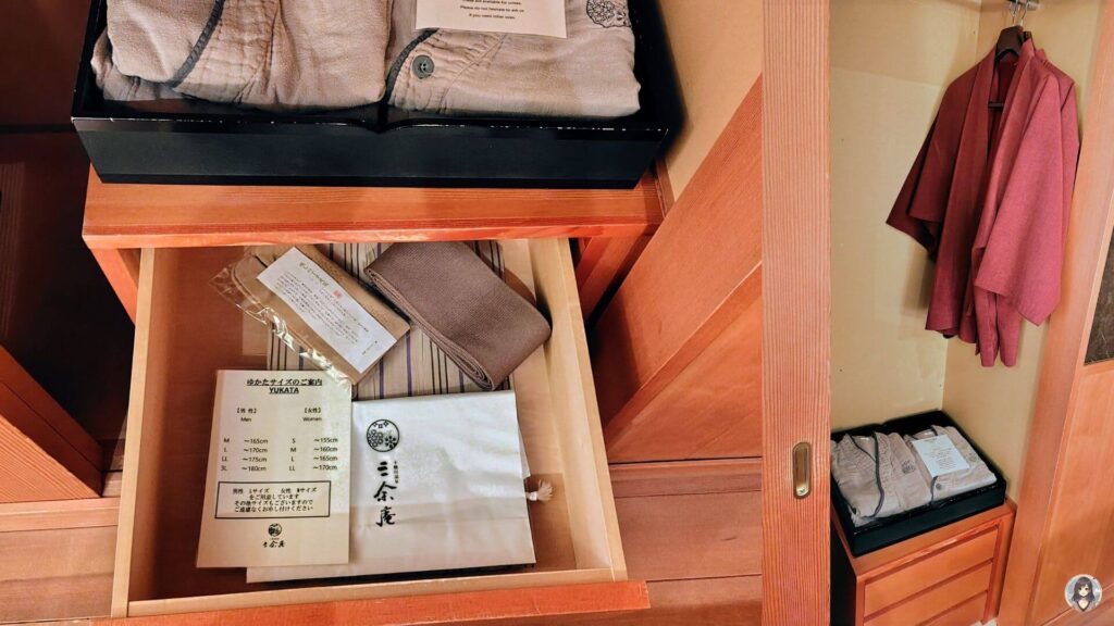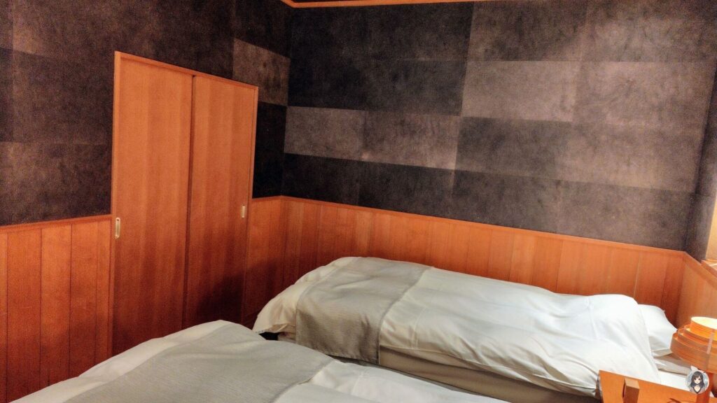 落ち着いた壁紙の寝室は、ゆったりと快眠できそうなマットレスです。クローゼットには、作務衣と上着、タオル類が入っていました。