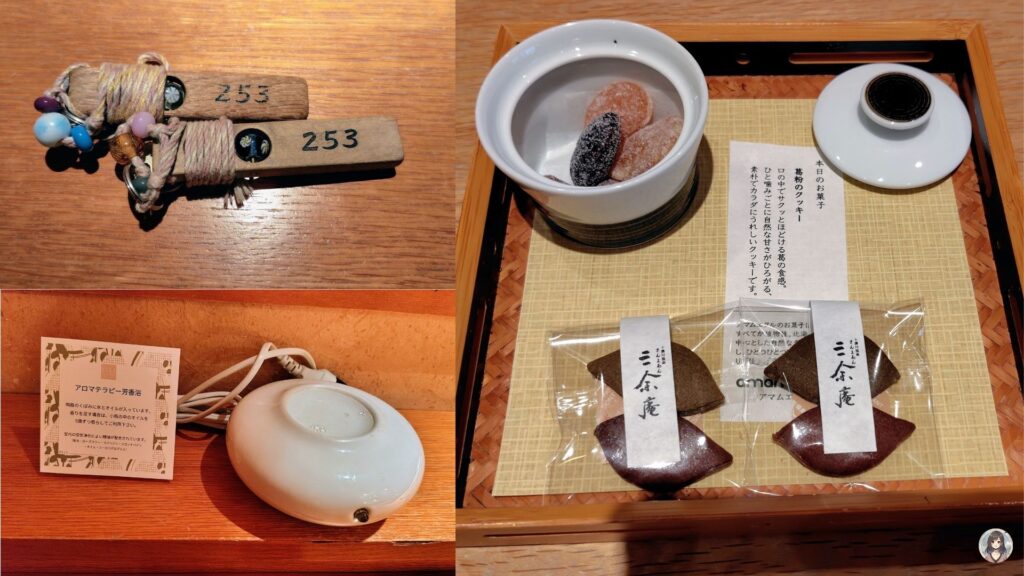 お茶菓子もあり、豆とクッキーとてもおいしい上品なお味でした。アロマテラピーも置いてあり、部屋で優雅な気持ちを味わうことができそうです。