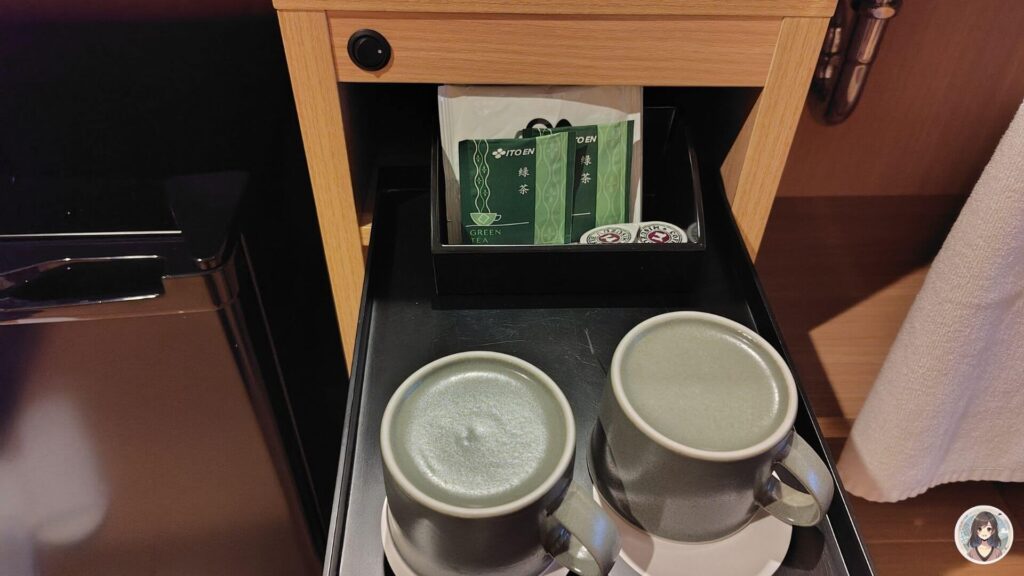洗面台の下の引き出しには、ティーパックの緑茶とドリップコーヒーが人数分入っていました。マグカップが可愛くて個人的に気に入りました。