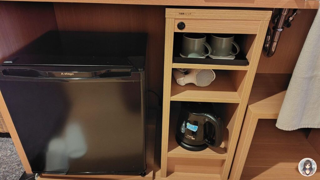 洗面所のすぐ横にハンガーと湯かごがありました。冷蔵庫や湯沸かしポット、コップ類は洗面所の下にあります。
