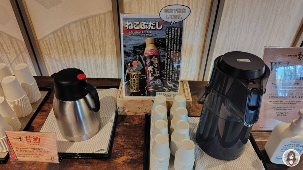 アルコール0%の甘酒が、冷えた体に温かくてとてもおいしく、数杯飲みました。北海道コーンは、コーンの風味を強く感じられる、すっきりとしたお茶でした。
