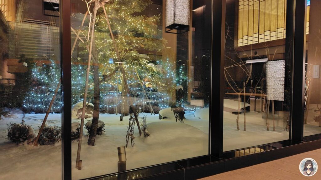 フロントの横には、中庭が見えるエリアもありました。訪問時は雪が積もる1月だったため、きれいな雪景色が見えます。
