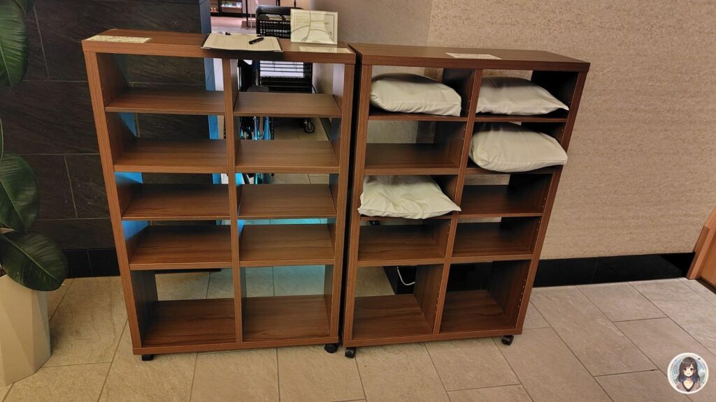 中庭横には、枕の貸し出しサービスがありました。在庫がほとんどなかったため、枕をレンタルしたい方は早めに乙津れることをお勧めします。