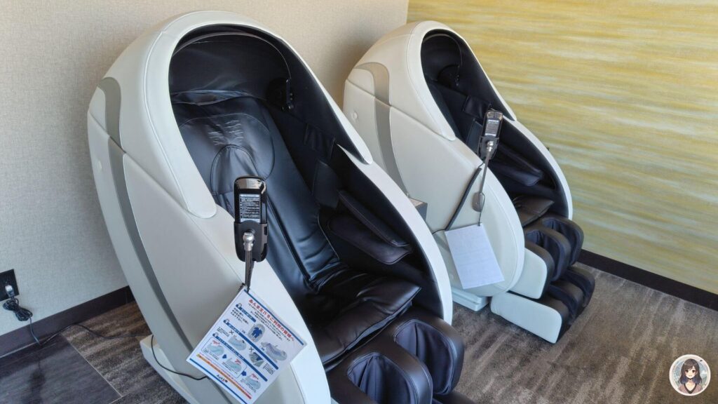 天海の湯をでたところに、湯上り処があります。3人掛け程度のソファ4台と、マッサージチェア(有料)が2台ありました。